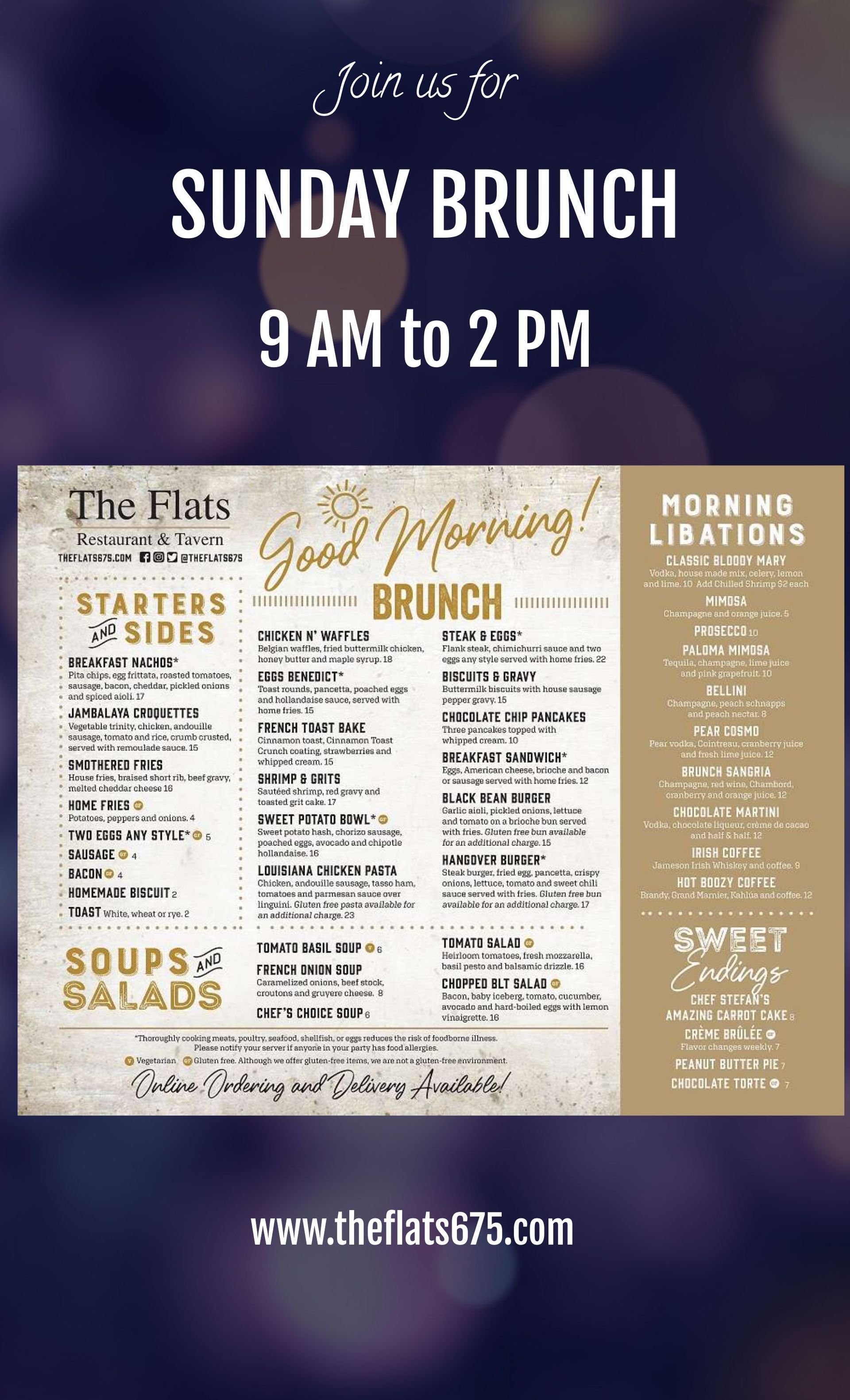 The Flats welcomes you for lunch, dinner, or Sunday brunch. Whether having drinks with friends at the bar, enjoying a seasonal meal on our patio