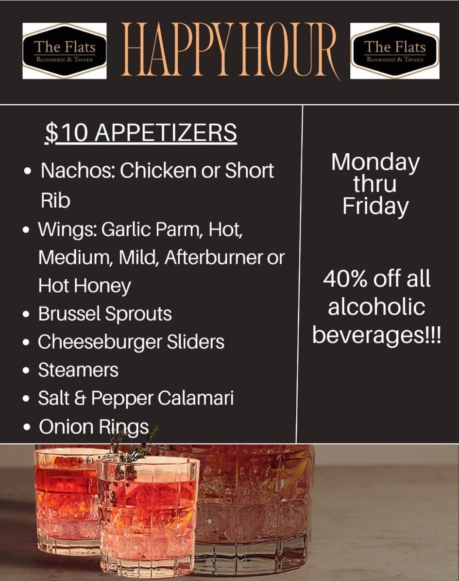 "The Flats Restaurant and Tavern, LLC ("The Flats") is a locally owned and operated full-service restaurant focusing on tavern favorites with a flare while introducing you to an altogether new and elevated food experience with our weekly specials. Offering dine-in, take-out, and delivery service, The Flats welcomes you for lunch, dinner, or Sunday brunch. Whether having drinks with friends at the bar, enjoying a seasonal meal on our patio, or gathering with friends and family in our modern industrial dining room, you're sure to enjoy a delicious culinary experience, with exceptional service and warm hospitality."